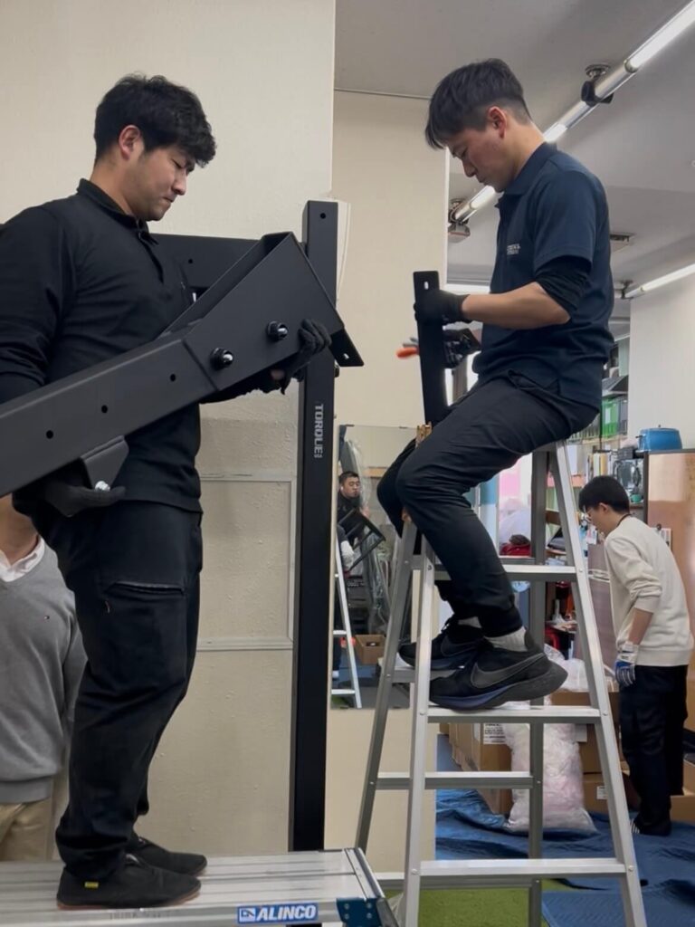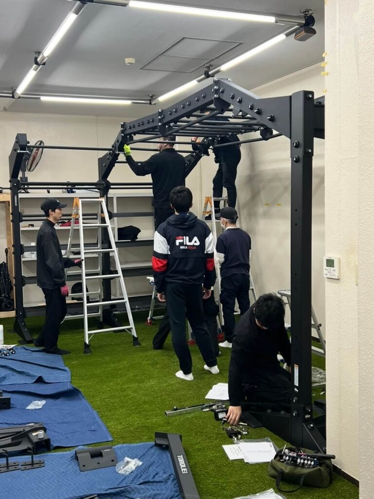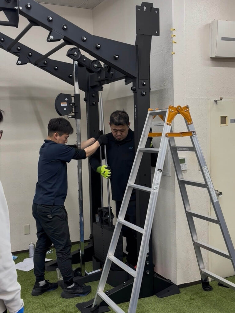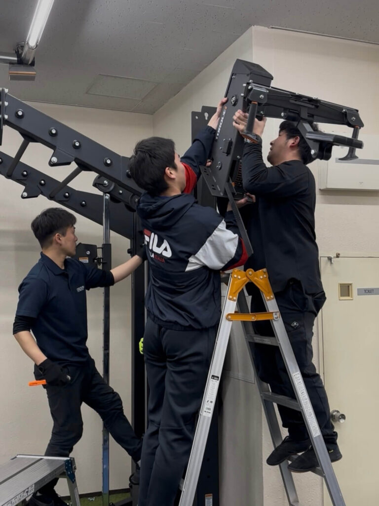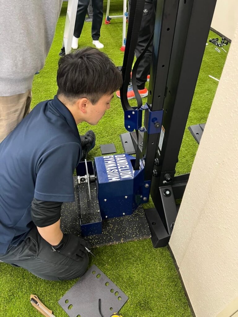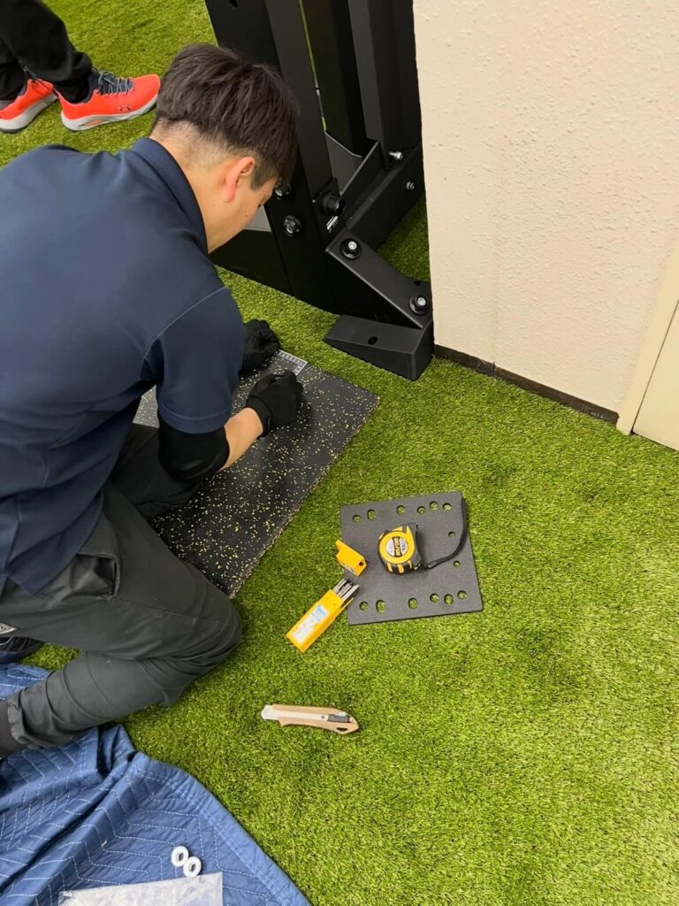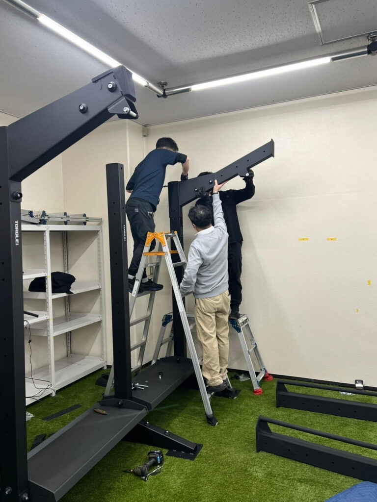 今回、設置で一番の懸念点だったのが、既存の「フライホイールトレーニングマシン」との兼ね合いでした。 しかし、職人さんたちが現場で臨機応変に対応してくれました。