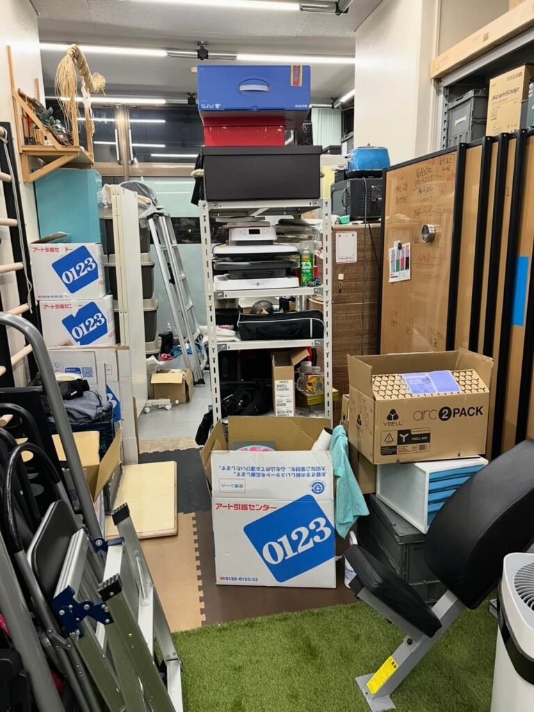 気を取り直して、本日のメインミッションです。 各ボックスの中身を整理し、ラックへのトレーニングツールの置き場を確定させながら、とにかく「運動スペース」を確保しました。