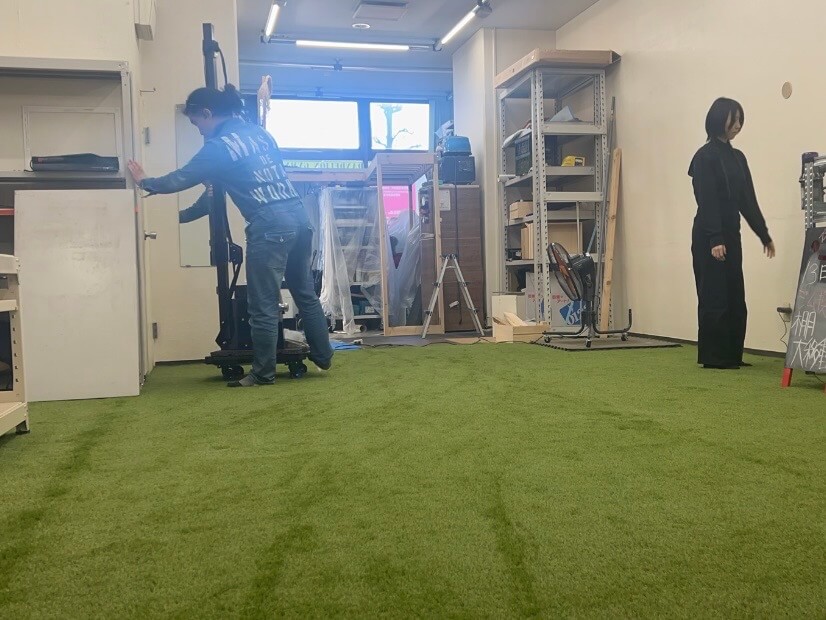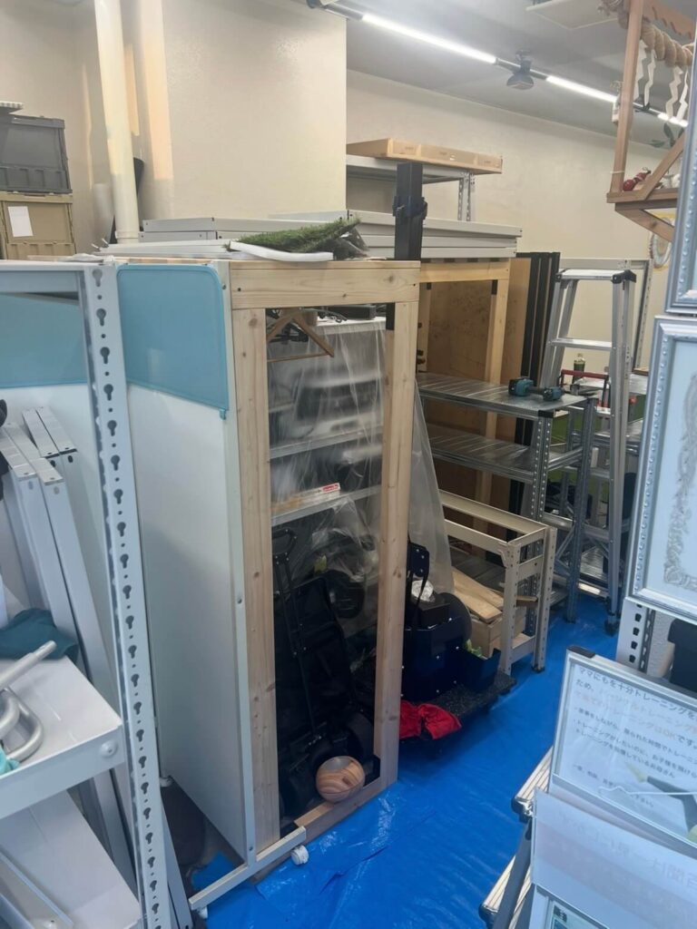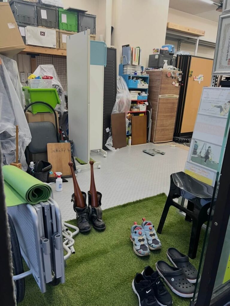 現在のジムの状況を一言で言うなら、「荷物の壁」。 玄関から新しい人工芝エリアにたどり着くためには、わずか60cm幅の細い通路を抜けるしかありません。