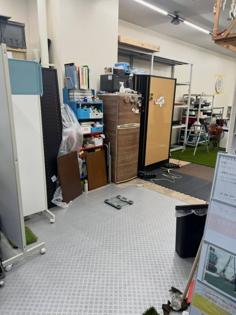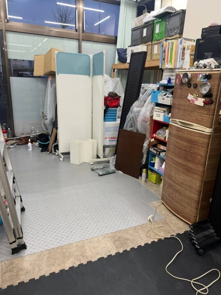 立っている場所、わずか60cmの通路しかなかった「壁」から、ようやくジムらしい広がりが見えてきました。 フロアマット全部張り替えなかったツートンカラー。ここに、明日以降いよいよ本格的に棚の荷物が並び、そして……TRXフレームエレベーテッドに変わってあのマシンを搬入することが可能になりました。