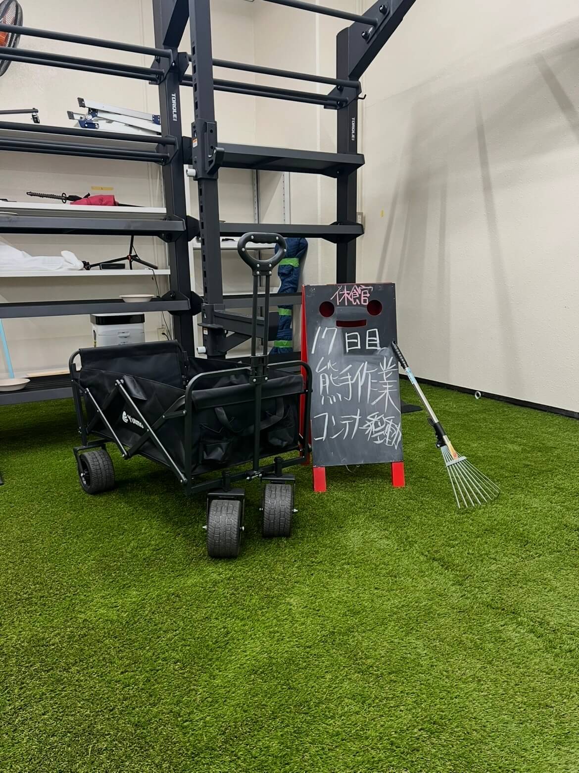 今回の人工芝は密度が非常に濃いため、寝てしまっている芝目を起こす作業が必要です。 そこで登場するのが「熊手」です。