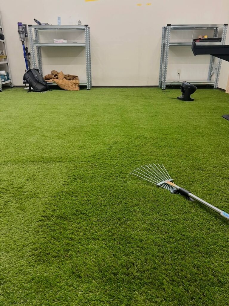 ボンドの乾燥も進んだので、そろそろ暖房をつけても良い頃合いかもしれません。 部屋を暖めて水分を飛ばすと、人工芝がフワフワになってくるからです。