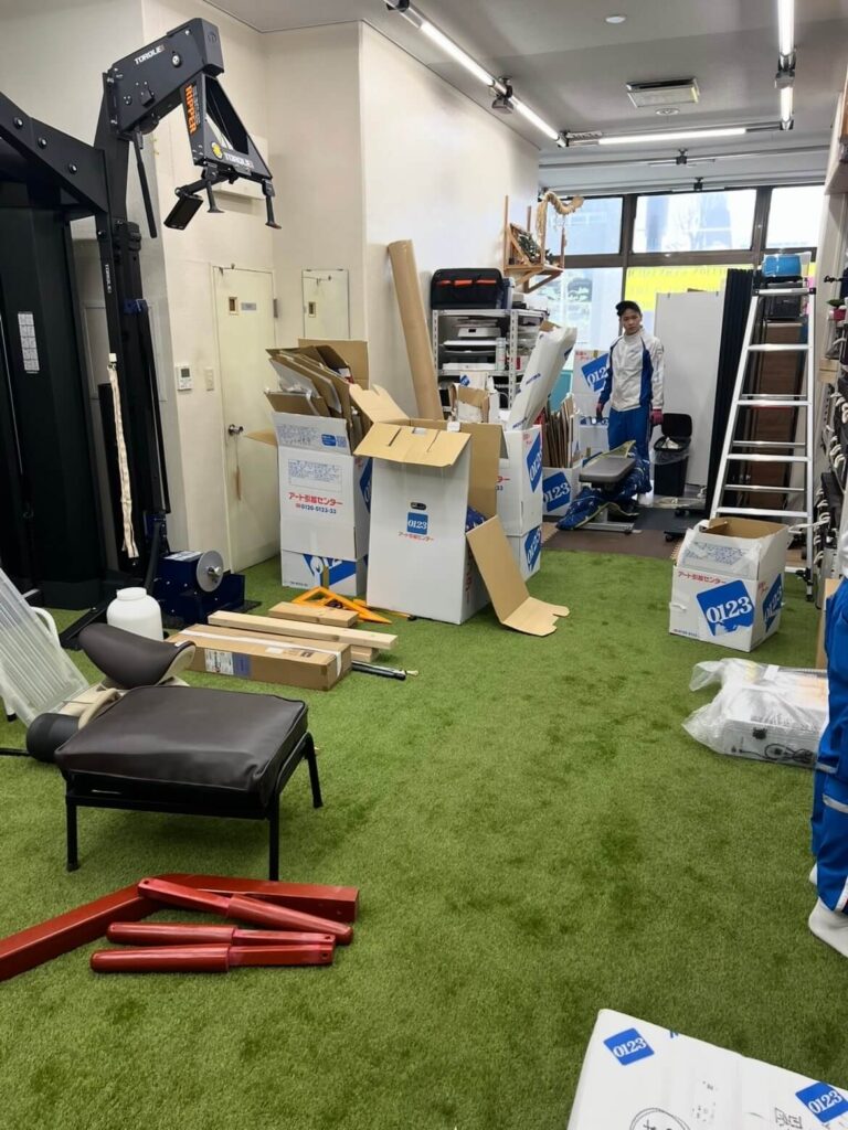 この休館期間中、個人では対応できない大きな山場がいくつかありました。「引っ越し預け」「復旧工事」「人工芝張り替え」「マシン搬入」。そして本日最後の砦である引っ越しリターンです。