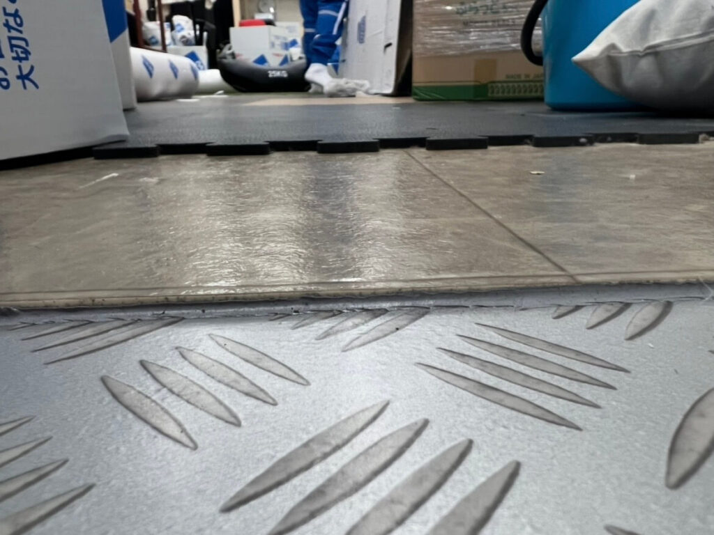 結果として生じた「2枚分の段差」。養生シートの上からでもはっきり分かります。 会員の皆様、再開後はこの段差での躓き(つまづき)にくれぐれもご注意ください。