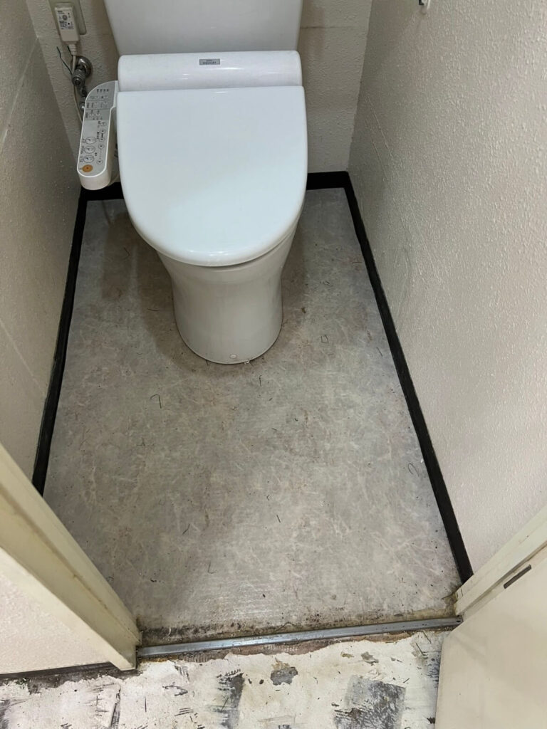 1. トイレの床問題 ここも汚水漏水の事故現場ですが、床を綺麗に貼り直すには「便器」を外さなければなりません。見切りもついていますが、大掛かりな作業が必要です。
