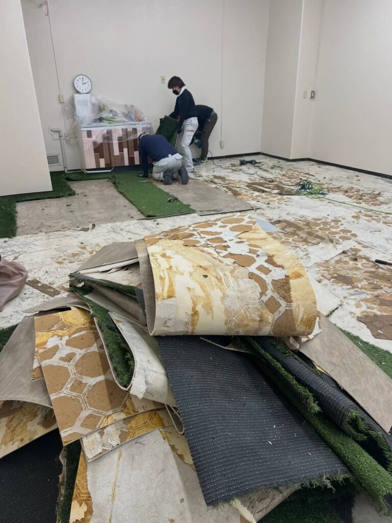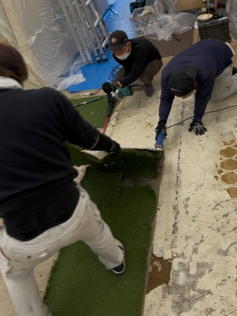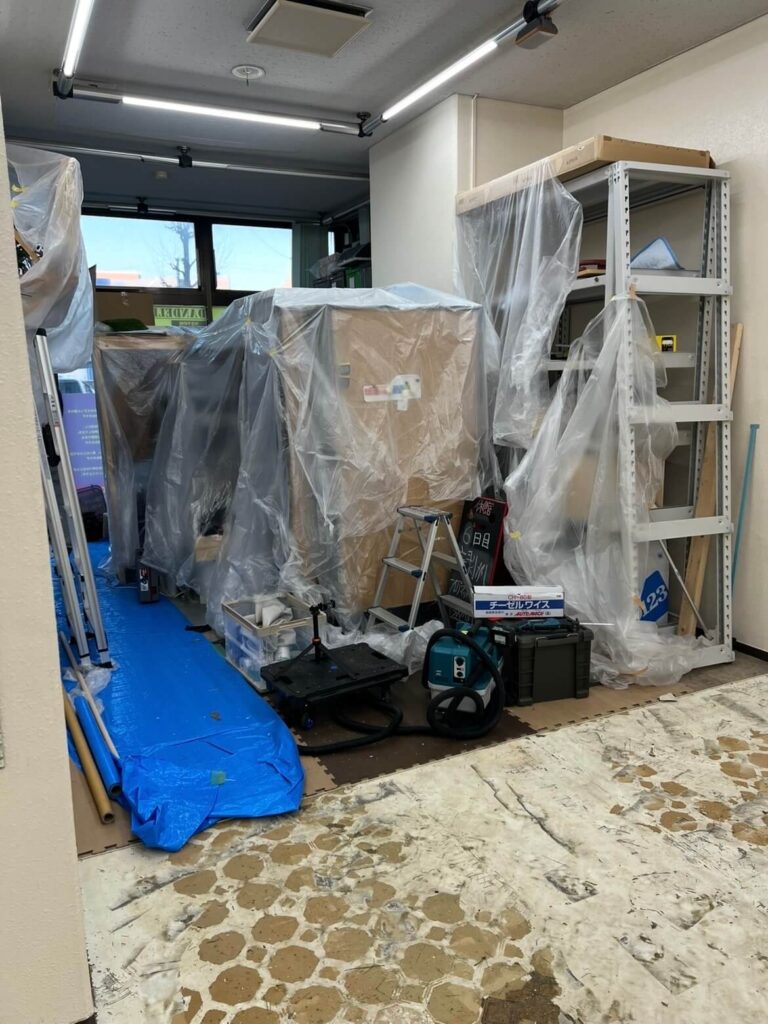 今回は、フロアマットを「剥がす」だけで、「敷かない(コンクリート剥き出し)」状態にします。 これは、当初私が第一希望としていた「移転営業」を諦め、コストカット(1ヶ月休館の方がトータルの費用は確実に落とせる)と、復旧工事短縮のために提案した妥協案です。