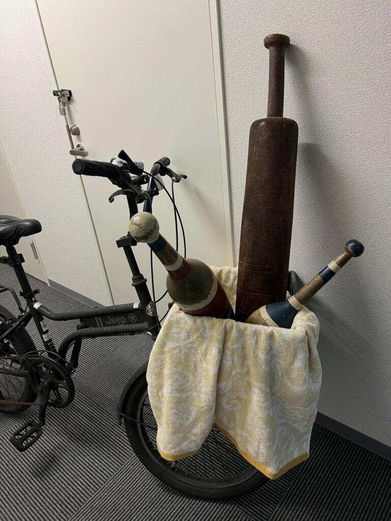 3. コシティとインディアンクラブの緊急避難 これから使う人工芝用ボンド(シンクボンド503・ウレタン樹脂系)は、先日のブログでも書いた通り、強烈な化学臭がします。 木製の器具(インディアンクラブやコシティ)に匂いが移るのを防ぐため、急遽自転車でコンテナへ移動させました。