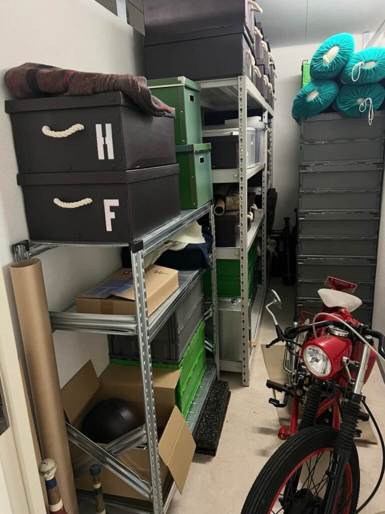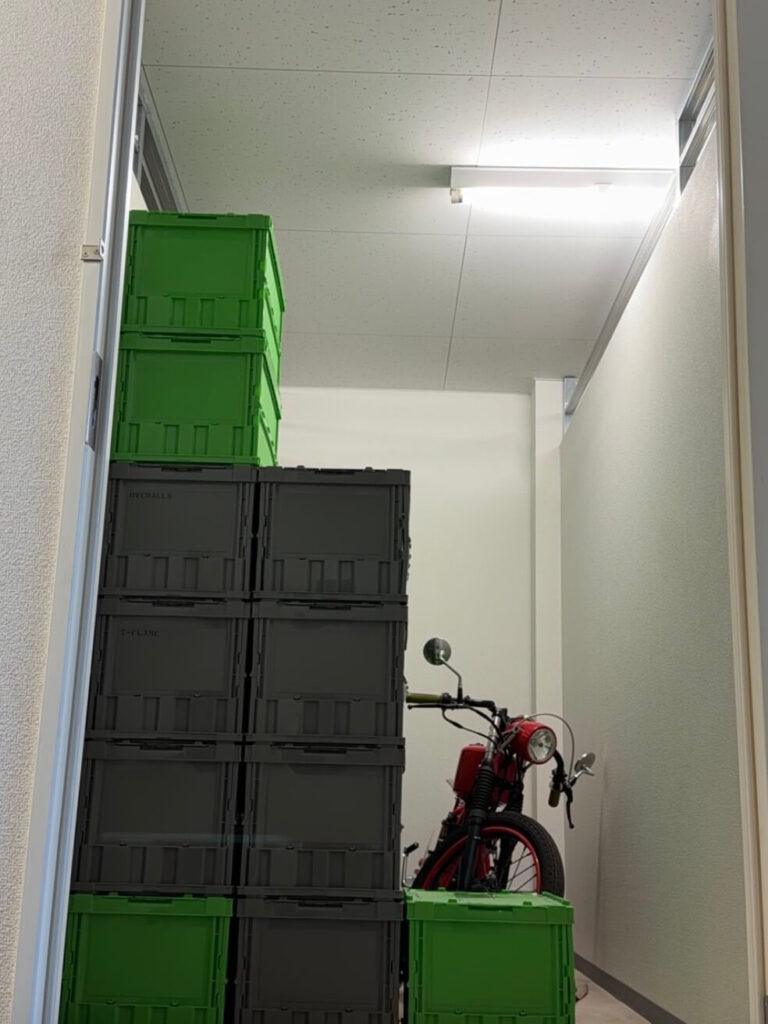 時間がある時に荷物は運び込まないといけないので、1人でも荷物を運び出せるように奥にバイク、手前にボックスを移動。コンテナルーム内の棚4つをジムに移動させるのが本日の目的です。