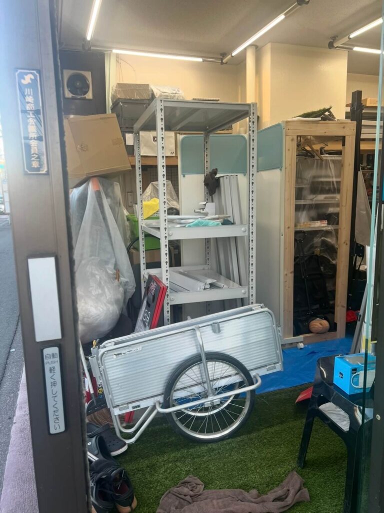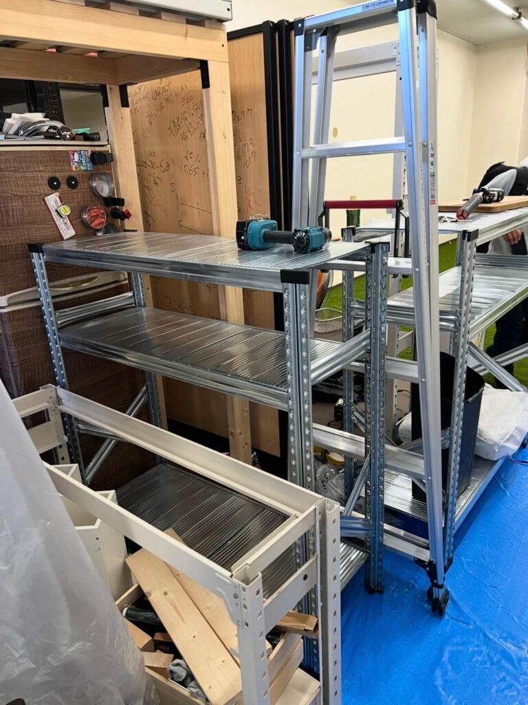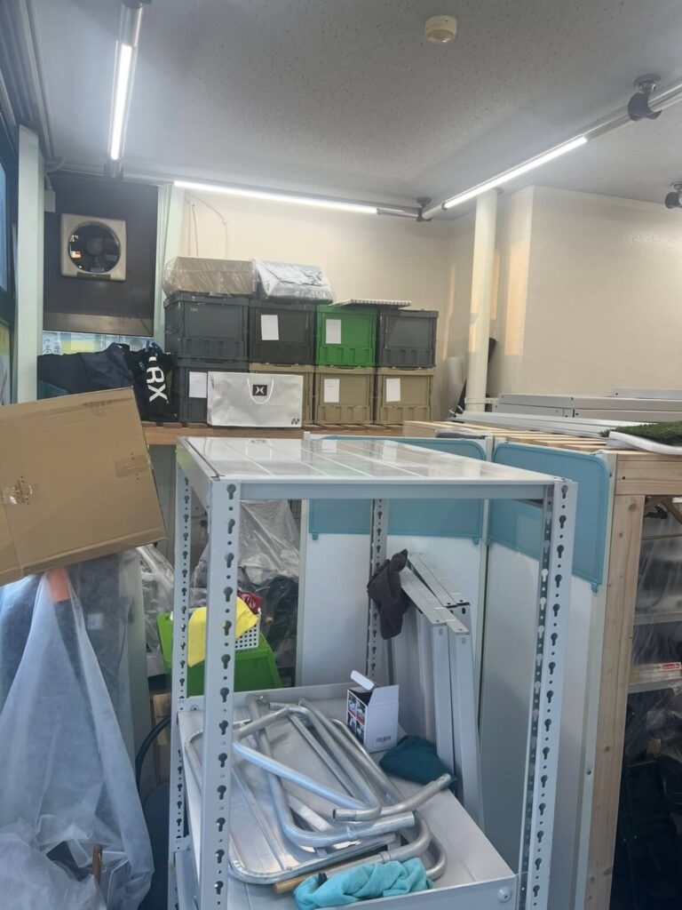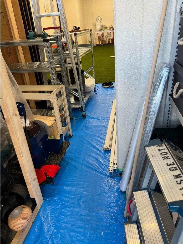 2人の頑張りで、無事にコンテナルーム内の整頓と、棚の移動が完了しました。 ジム内は、人工芝以外のスペースに計11個の棚が乗り、通路以外ほとんどスペースがない状態ですが、なんとか収まりました。