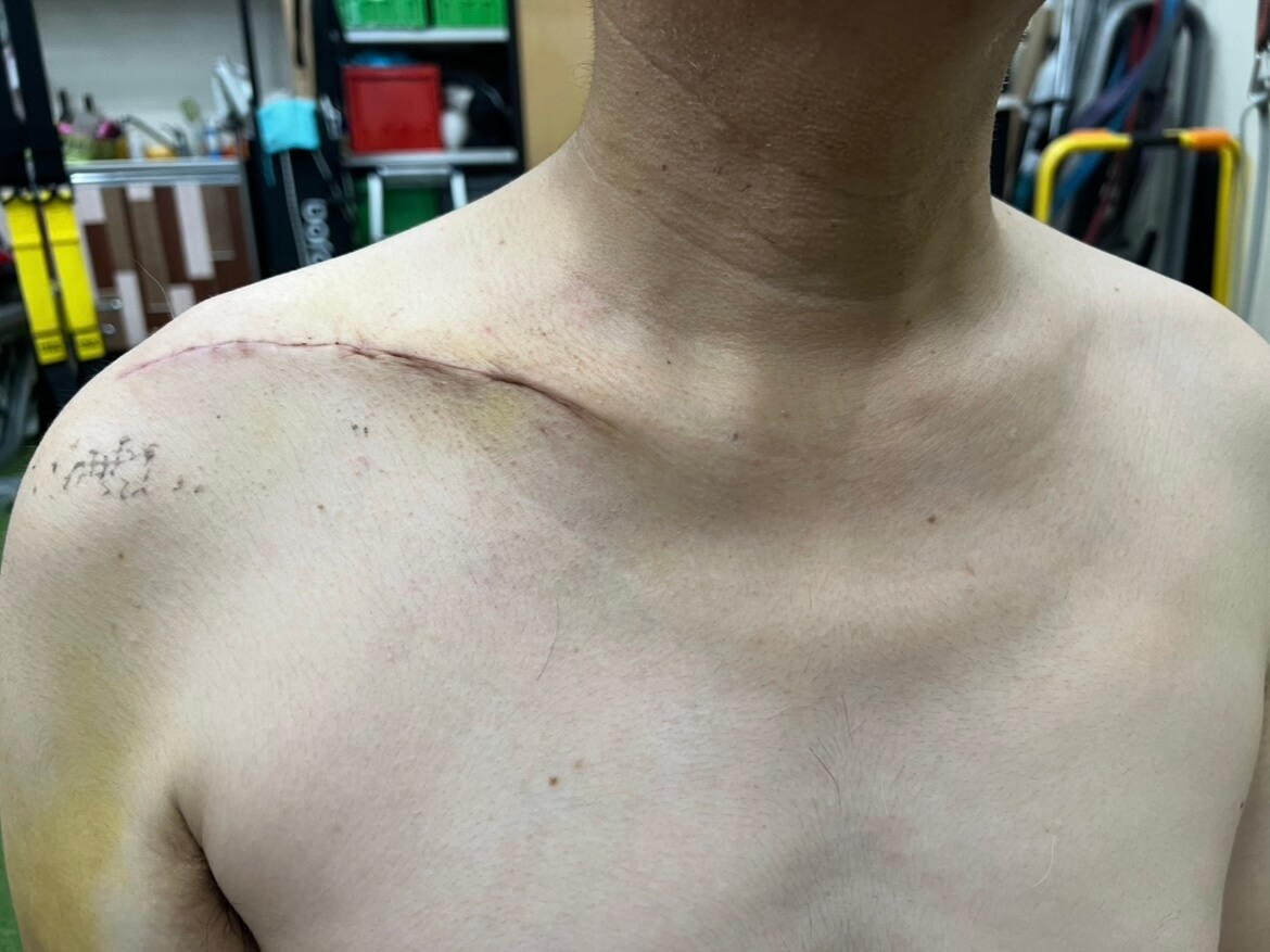 「転んでしまって…。右の鎖骨を骨折して、手術したんです」と連絡もらっていましたが、