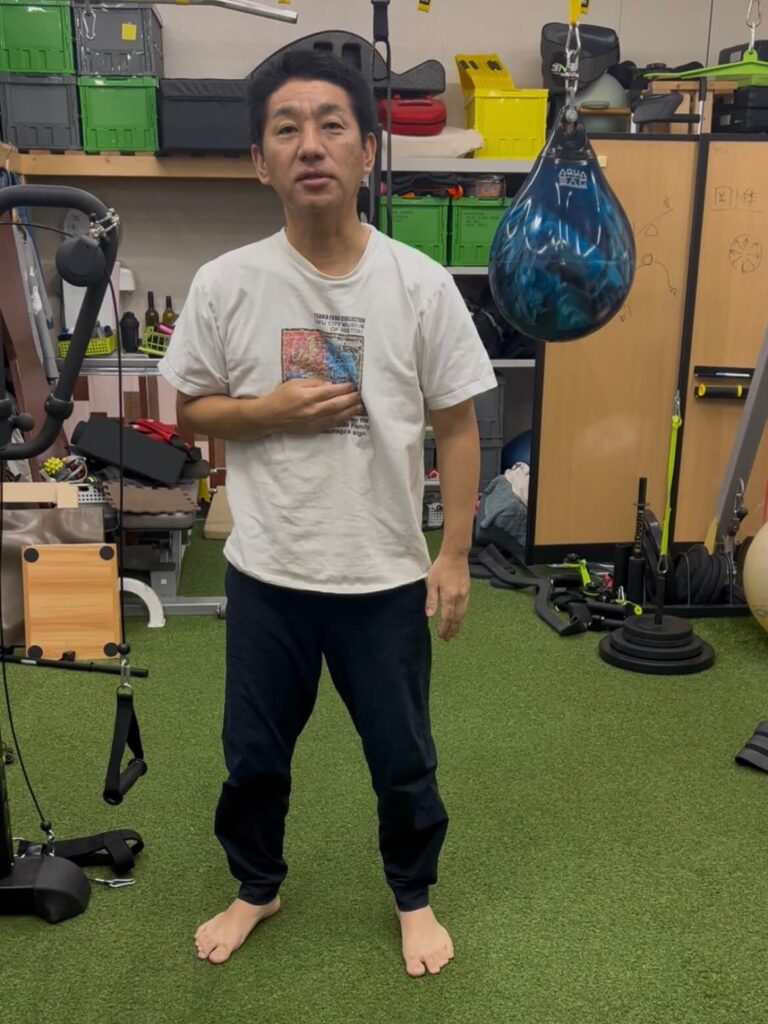 たったこれだけであれほど傾いていた姿勢は、すっと中心に戻り、円背も解消されました。